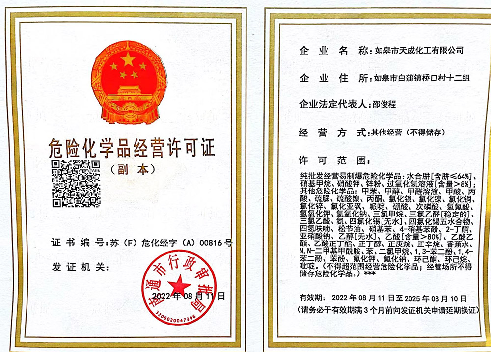 ? 如皋市天成化工有限公司創建于1996年。公司地處于美麗富饒的長江三角洲,座落在古鎮林梓,通揚運河河畔。南瀕長江、西臨204國道,距南通港、飛機場30公里,立體交通發達。公司經營管理規范,技術力量雄厚,擁有一批高、中級專業技術人才。 公司主要產品為:無水四氯化錫、結晶四氯化錫、氯化亞錫、三氯乙酸、甲酸銨、苯甲酸銨、對硝基苯酚、對硝基苯甲酸、苯乙醛、癸醛、防腐劑等。產品品質優異、價格合理,主要銷往北京、上海、廣州、福州、安徽、江西等省市,并出口歐美、東南亞等國家和地區,一直深受廣大新、老用戶的好評。 公司連年被評為“重合同守信用企...[更多內容]